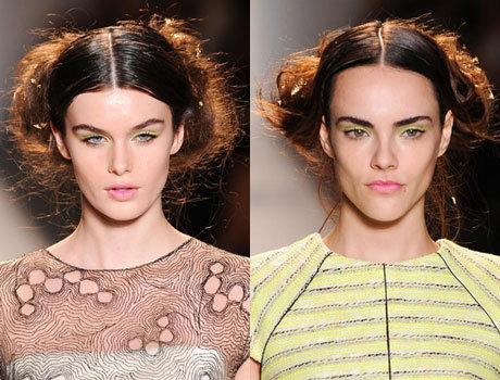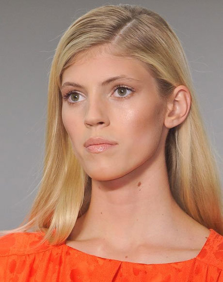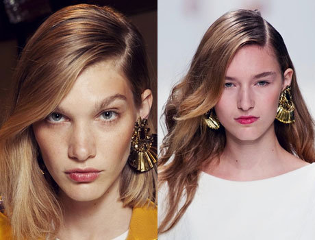 Так называемый мягкий боковой пробор создается чуть от центра головы, не доходя до макушки. Стилист Марк Хэмптон украсил таким пробором прическу моделей показа Matthew Williamson. Спрятав пряди с правой стороны за ухом и сделав начес с левой, он создал эффект объемных летящих волос.