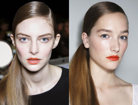 Гладкий низкий хвост на пробор или зачесанный назад – это классика. Простая школьная прическа делает образ изящным. Главное, дополнить образ яркими акцентами в макияже – например, нанести оранжевую помаду или сделать модные стрелки.