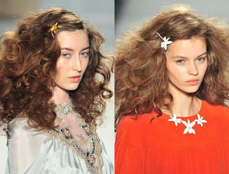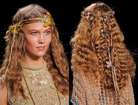Дизайнер Anna Sui, любительница богемной эстетики, украсила прически моделей лентами с крупными цветами. Едва заметный макияж, распущенные волосы – образ в стиле хиппи-шик смотрится романтично и ненарочито.
