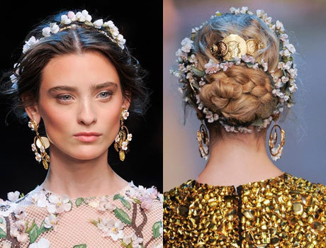 На головах моделей Dolce&Gabbana «выросли» настоящие розарии. Они перекликались с принтами на платьях и украшениями. Впрочем, такое богатое «убранство» ничуть не перегружало образ. Наоборот, модели были похожи на настоящих богинь, спустившихся с Олимпа.