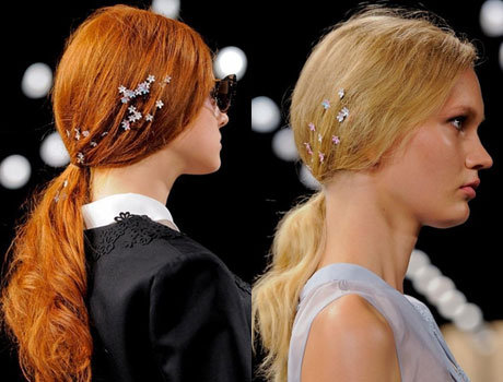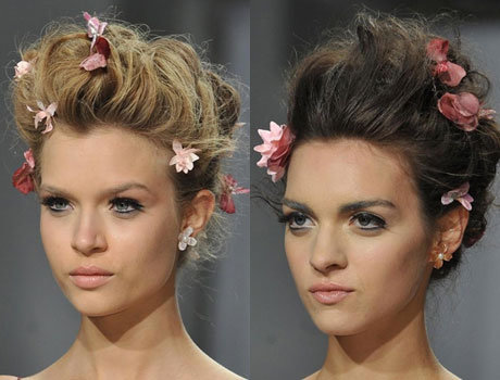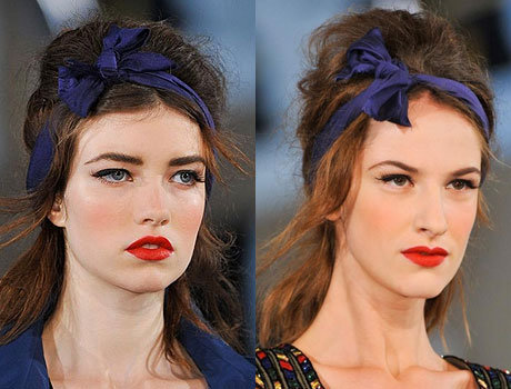 Например, синие ленты, повязанные в виде банта вокруг причесок с начесом моделей Alexis Mabille, сделали из них девушек в стиле пин-ап. Такая деталь – примета времени, а подобная укладка хорошая идея для вечеринки.