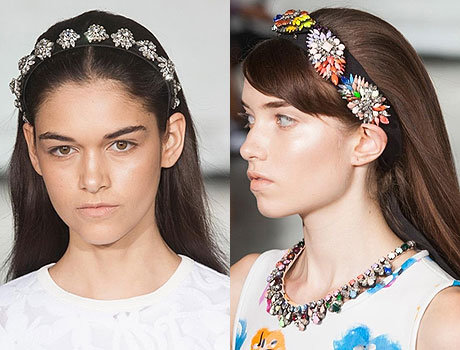 Стилисты Tanya Taylor отдали предпочтение эпохе барокко. Поверх прямых волос моделей они повязали ленты, украшенные драгоценными камнями и жемчужинами. Такие аксессуары роскошнее всего будут смотреться на кудрявых волосах.