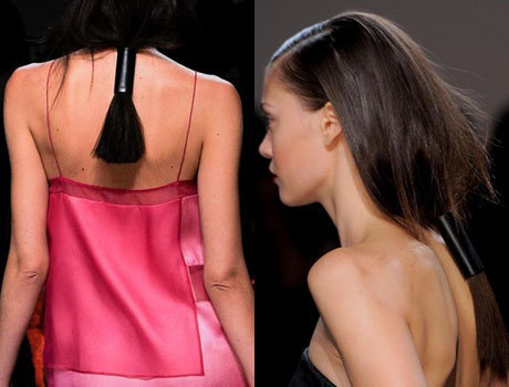 Стилисты Helmut Lang предложили обернуть супернизкие хвосты моделей кожей. В сочетании с шелковыми вечерними платьями резинки из кожи выглядели элегантно и экстравагантно одновременно.