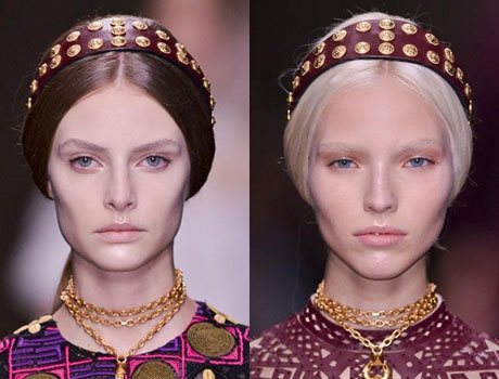 То, что такая простая деталь как золотой ободок может выглядеть как тиара, доказали стилисты показа Elie Saab. Они оставили видимой только центральную часть украшения, закрыв его по бокам волосами. В сочетании с вечерним классическим платьем образ получился гламурным.