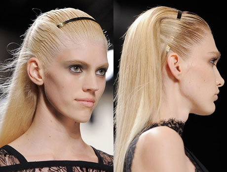 Наиболее интересными нам показались кожаные повязки. Представленный Valentino вариант кожаных повязок, украшающих низкие хвосты, отражал элегантность и современную женственность.