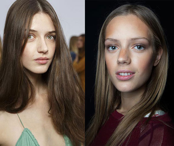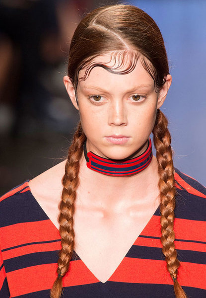 Еще одно веяние из прошлого, дань семидесятым годам – это челка-обманка. Созданная с помощью геля и отдельно выпущенных на лоб прядей, как у DKNY, воплощенная при помощи хвоста, зачесанного на лоб (Kenzo) или глубокого пробора, она придает образу мальчишеского стиля и ненарочитой женственности.