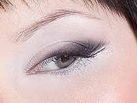 Льдистые тени на нижнем веке «распахивают» глаза, придавая черной линии подводки легкость. А белый карандаш-кайял на нижнем слизистом крае подчеркивает глубину цвета глаз. На ресницы наносим черную тушь в несколько слоев. Линия взмаха ресниц должна поддерживаться направлением подводки.