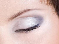 При выполнении сияющего макияжа в футуристическом стиле «серебро металла» используем: перламутровую базу под макияж, пудру со светоотражающими частицами, серебряные и темно-синие перламутровые тени, темно-синий карандаш для век, тушь, прозрачные румяна и блеск для губ.
