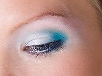 На внешней части век продолжаем линии бирюзовым карандашом, соединяя их в уголке глаза. Растушевываем карандашные штрихи и закрепляем их тенями. Для этого возьмем нежно-розовые и бирюзовые перламутровые тени. Тени, нанесенные поверх карандаша, выглядят намного ярче, а растушевка смотрится нежно и натурально. Цветная синяя тушь придаст ресницам объем и цветную прозрачную дымку.