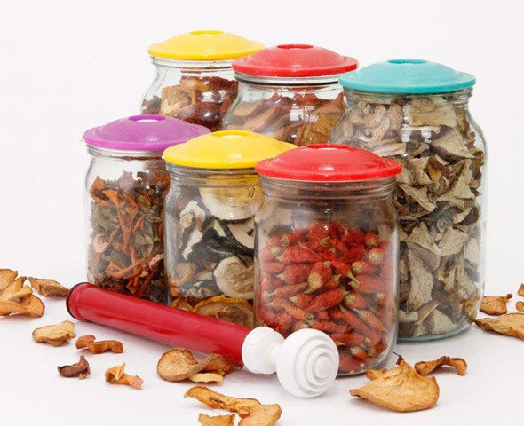 Это система хранения продуктов и напитков в ваккуме. В наборе представлено несколько крышек и насос, который откачивает воздух из банок. В результате крышки держатся прочно — очень просто и оригинально. Изобретение запатентовано.