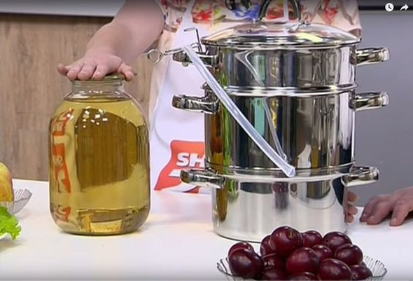 Это приспособление поможет вам сделать натуральный сок из фруктов и овощей без добавления воды. Процесс обработки паром проходит легко и быстро. И вам остается разлить по банкам и запечатать готовый сок.