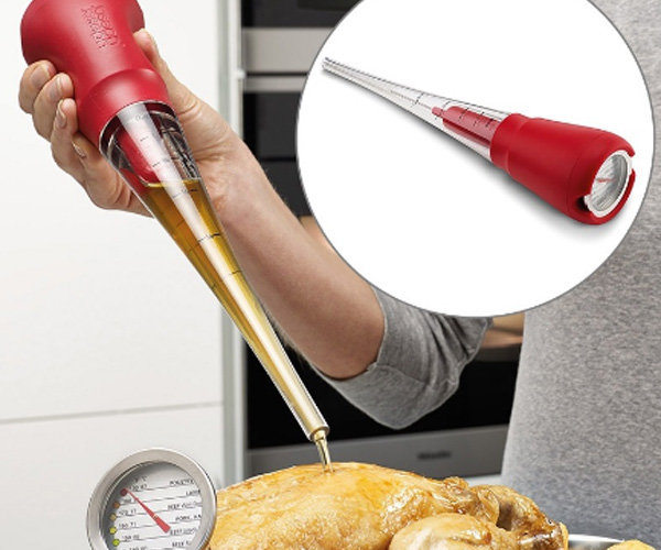 Как сделать так, чтобы всегда получалось вкусное и сочное мясо? Мультиинструмент для запекания поможет добиться идеального результата. С помощью дозатора вы можете распределить маринад по поверхности и внутри мяса (если вы запекаете курицу или индейку), он работает по принципе пипетки. Встроенный термометр поможет контролировать температуру запекания, чтобы добиться идеальной корочки (хранится в силиконовой части дозатора). Также внутрь помещается для компактного хранения специальная щетка, которая помогает чистить дозатор. Инструмент термостойкий, изготовлен без использования вредного бисфенола-А (BPA free).