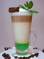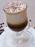 | Кофе «Капуччино шоколадный» Кофе эспрессо - 30 мл, Подается этот кофе в прогретой чашке для капуччино емкостью 130-150 мл. В чашку добавить шоколадный соус и приготовить в нее эспрессо. Посыпать корицей, какао или тертым шоколадом. | Кофе «Мокко» Соус шоколадный - 20 мл, Подается в прогретом стеклянном стакане емкостью 250 мл. В стеклянный стакан налить шоколадный соус, далее налить горячее вспененное молоко, после паузы в 10-15 секунд тонкой струйкой влить эспрессо. |