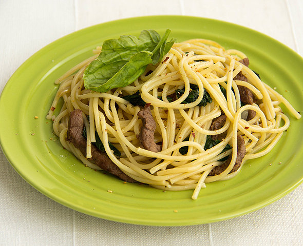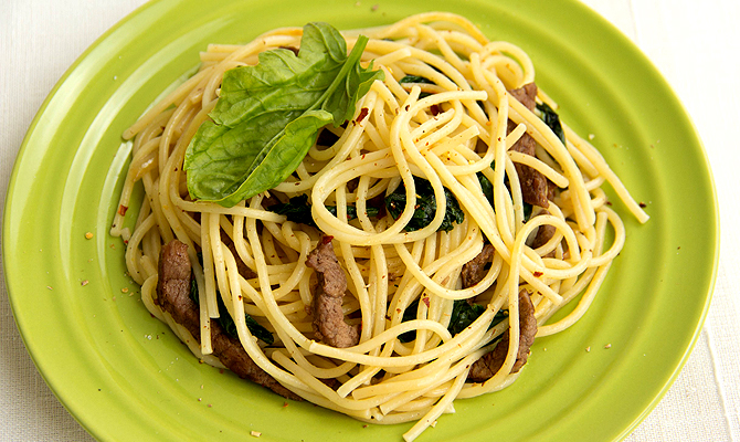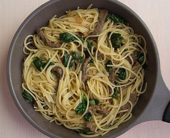 Как только шпинат будет готов, переложите в сковороду спагетти и мясо, перемешайте и прогрейте в течение двух минут. При необходимости приправьте солью и перцем.