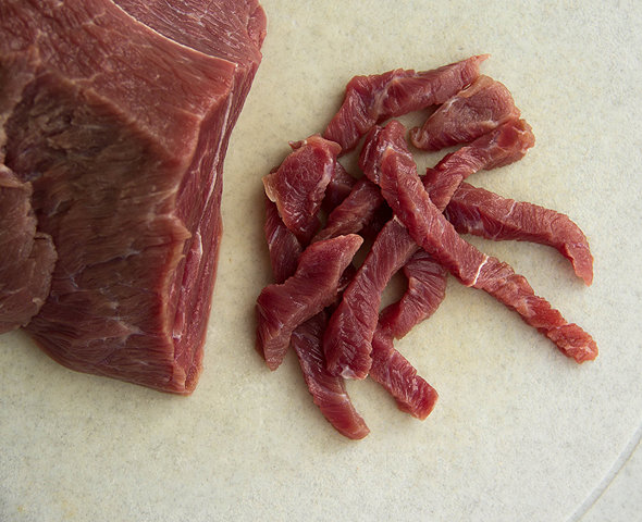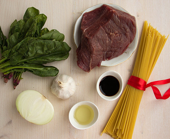 Отварите спагетти в подсоленной воде по времени, указанному на упаковке. Мясо нарежьте тонкими ломтиками.