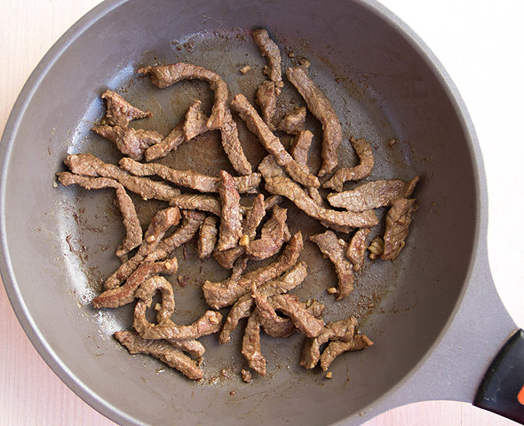 Пожарьте мясо на сковороде до готовности, затем переложите на тарелку.