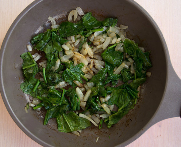 Лук мелко нарежьте и обжарьте до прозрачности на этой же сковороде. Листья шпината хорошо промойте, крупно нарежьте и добавьте в сковороду к луку.