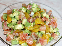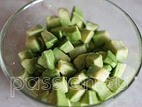 | | | | | | Авокадо разрезать пополам, вынуть косточку, очистить от кожицы и нарезать кубиками. Полить лимонным соком. | | |