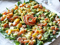 | | На блюдо выложить рукколу, сверху - салат с авокадо. В центр выложить розочку из сёмги. Полить заправкой. |