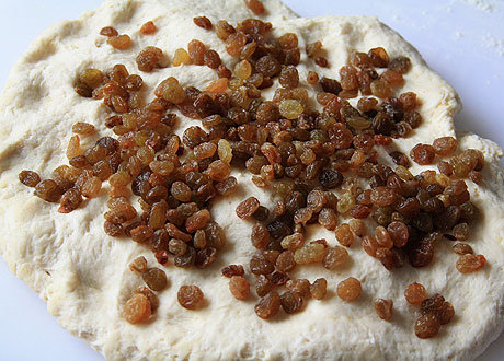 Немного раскатать тесто, выложить на него изюм, присыпать его небольшим количеством муки и еще раз вымесить.