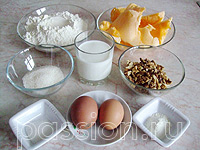 | | | | | | | | Муку смешать с разрыхлителем, ванильным сахаром, измельченными грецкими орехами. Осторожно ввести получившуюся смесь в тыквенную массу. | | |