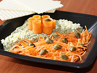 | | Пасту из авокадо выложить в блюдо, украсить свёрнутыми полосками моркови, в центр каждой поместив каперс. Яичный желток раскрошить сверху. Рядом выложить натёртую морковь, украсить её каперсами. Подать с вафельными хлебцами. |