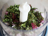 | | | | | | Лук очистить, нарезать произвольно и смешать с зеленью петрушки и укропа в блендере. | | |