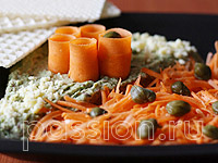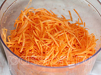 | | | | | | | | Морковь почистить, с помощью овощерезки нарезать тонкие полоски моркови для украшения. Остальную морковь измельчить с помощью тёрки. | | |