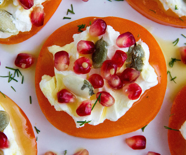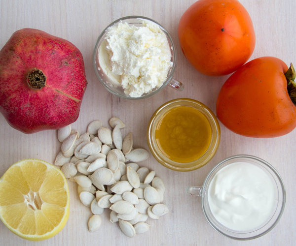 Посыпьте хурму очищенными тыквенными семечками и гранатовыми зернами. Смешайте мед и лимонный сок, полейте закуску медовой заправкой.
