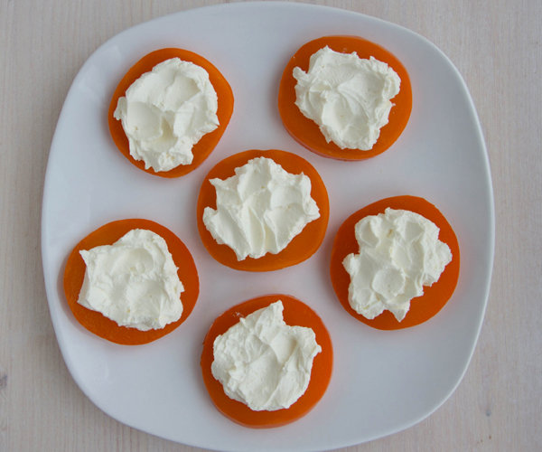 Колечки хурмы переложите на тарелку, каждое колечко намажьте сырной массой.