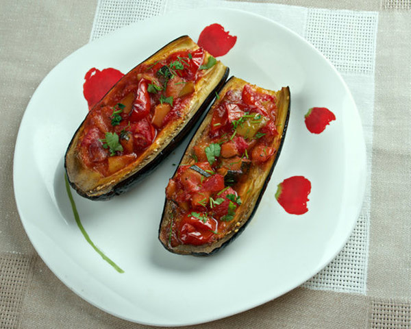 В сковороду, где жарились баклажаны, добавьте оливковое масло и обжарьте лук до мягкости. Добавьте к луку мякоть баклажанов, нарезанные перцы и помидоры, посолите и поперчите по вкусу. Готовьте, пока лишняя жидкость не выпарится. В самом конце добавьте чеснок, орехи и мелко нарубленную зелень. Разогрейте духовку до 180 градусов. В форму положите половинки баклажан, нафаршируйте их подготовленной начинкой и запекайте 30 минут. Подавайте холодным.