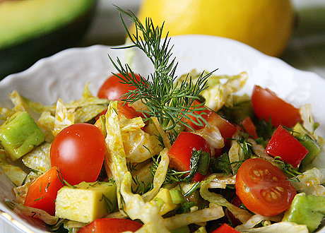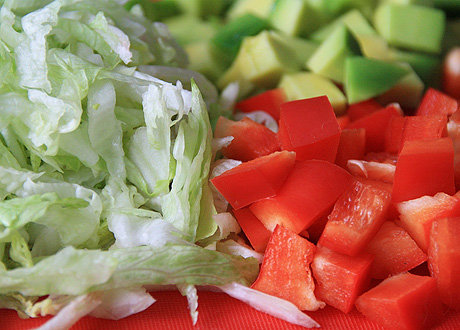 Капусту нарезать тонкой соломкой. Перец очистить от семян и плодоножки и нарезать средними кубиками. Авокадо разрезать пополам, удалить косточку и шкурку, нарезать средними кубиками.