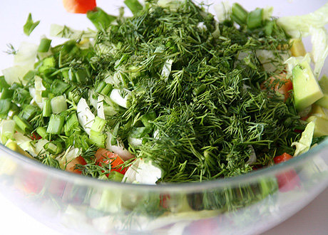Зелень укропа измельчить, зеленый лук нарезать мелко. Соединить зелень с остальными ингредиентами, добавить специи по вкусу и перемешать.