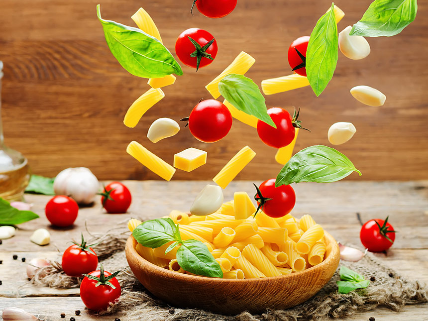 Как только вода закипит, чуть посолить и засыпать спагетти. В это время нарезать помидор и болгарский перец. Добавить на сковороду нарезанные помидоры и перец. Закрыть крышкой. Потушить минут пять-десять, а после залить сливками и добавить ложку муки. Перемешать. Подождать, пока соус загустеет. Снять с плиты.