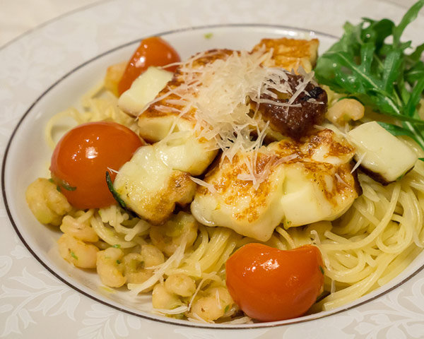 Потереть немного твердого сыра для украшения в отдельную тарелку. Далее выложить в тарелки спагетти. Сверху выложить сыр халумис. Украсить веточками рукколы и сверху чуть присыпать твердым сыром.