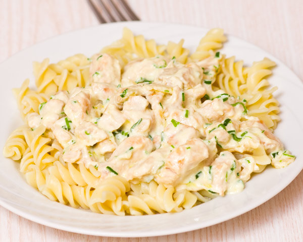 Поставить кипятиться воду для спагетти. Помыть все необходимые овощи. Мелко нарезать лук и чеснок. Куриную грудку нарезать на тонкие полоски. Обжарить на сковороде сначала лук, а потом добавить к нему чеснок и куриную грудку. Дождаться, пока курица побелеет.