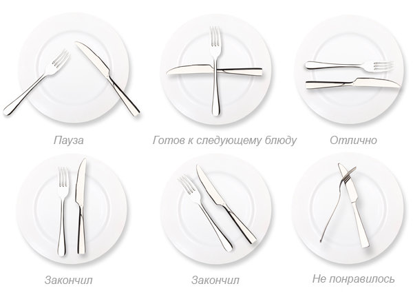 Если вилка и нож «смотрят» вверх на «без десяти пять», при этом вилка находится под ножом, а нож между зубчиков проникает в вилку, это означает, что вы остались довольны как едой, так и обслуживанием.