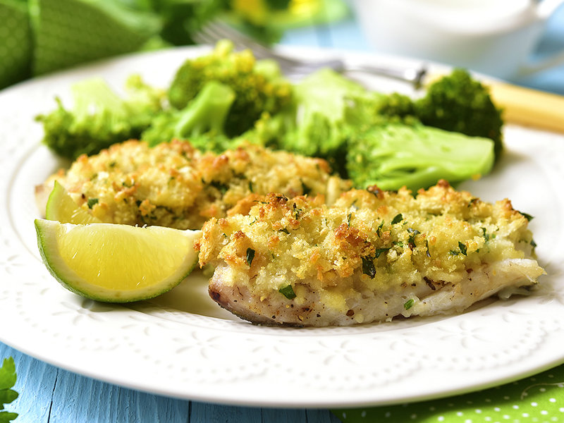 Филе трески тщательно промыть, нарезать на кусочки приблизительно 12 на 6 см. Выложить на противень, предварительно покрытый пищевой фольгой, и поставить на 5-10 минут в духовку, разогретую до 180 градусов.