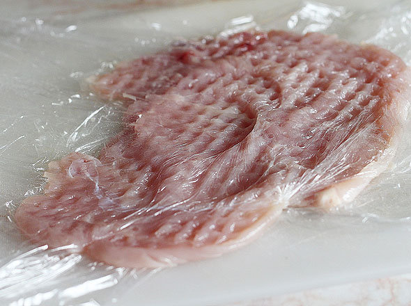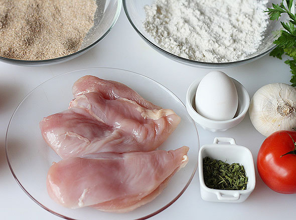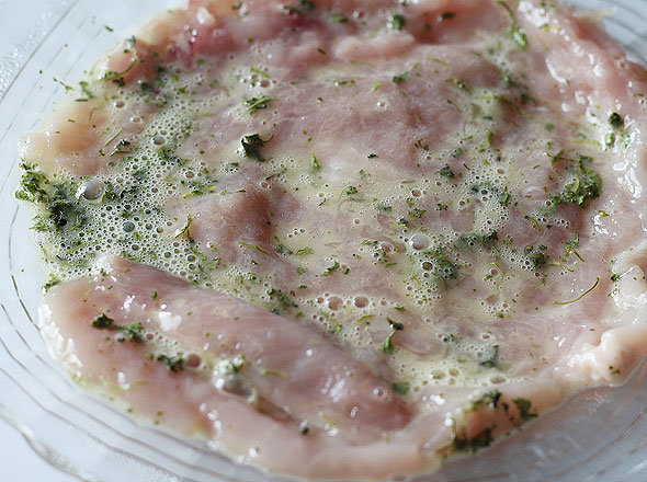 Куриную грудку промойте, обсушите и отбейте под пленкой с двух сторон. Посолите, поперчите и дайте немного времени полежать.