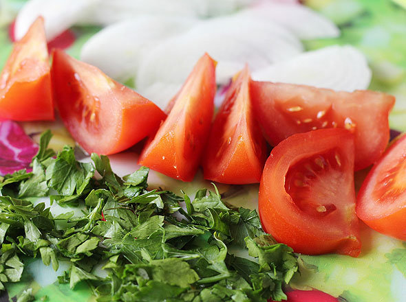 В это время приготовьте салат из помидоров, лука и зелени петрушки. Для этого помидоры разрежьте на части, лук тонкими полукольцами, зелень петрушки нарежьте крупно. Все соедините, поперчите. Посолите и полейте маслом для салата.