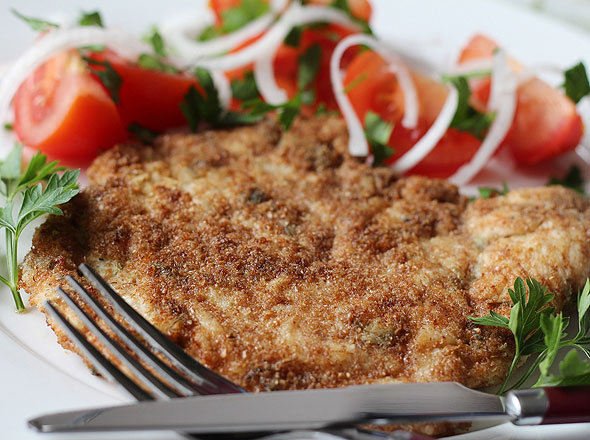 Яйцо взбейте, добавьте сухую петрушку, хорошо перемешайте. Обваляйте поочередно куриные шницели в муке, яйце и в пшеничных отрубях.