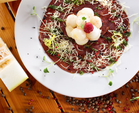 Говядину нарезать толщиной 1 мм. Из мякоти дыни вырезать кружочки, полить их клубничной заправкой, перемешать. На блюдо поместить говядину, в центр через кольцо выложить дыню.