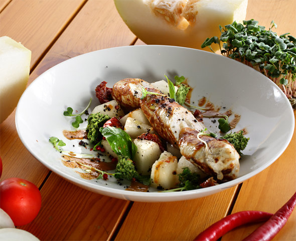 Куриное филе отбить, выложить в центр фету, брусочки дыни, завернуть рулетом, рулет завернуть в жировую сетку. Обжарить на растительном масле со всех сторон до золотистой корочки, довести до готовности в пароконвектомате при температуре 180 градусов в течение семи-десяти минут.