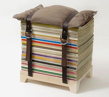 Бумага – очень прочный материал, но лишь с тем условием, что ее много. Например, стопка журналов может стать табуреткой. Нужно просто скрепить журналы вместе, и при желании добавить мягкое сиденье.