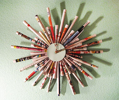 Очень необычно смотрятся часы из журнальных трубочек. Для их изготовления вам понадобится часовой механизм и журналы. Нужно просто склеить циферблат и прикрепить к нему механизм!