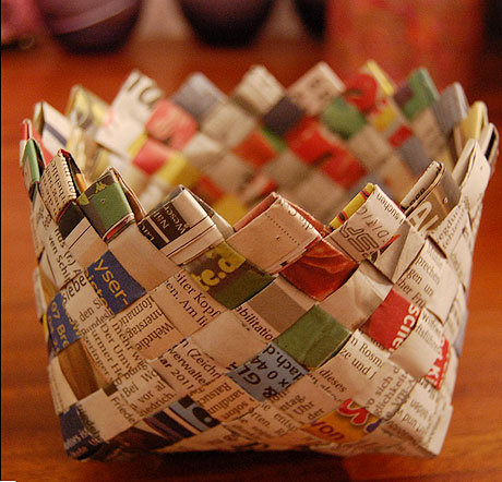 Можно скрутить из бумаги плотные трубочки, затем склеить их вместе по кругу или сплести из них корзинку. Кстати, существует такой вид рукоделия как плетение из газет, причем мастера делают таким способом очень красивые вещи, и они пользуются спросом у покупателей.