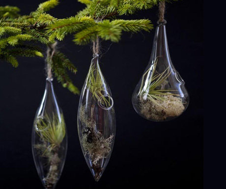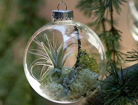 Пожалуй, одно из самых необычных украшений для елки – живые растения. Их помещают в прозрачный шар и вешают на елку. Кстати, такие игрушки, а также брелоки и сувениры с живыми растениями, можно купить в магазинах или сделать самостоятельно.