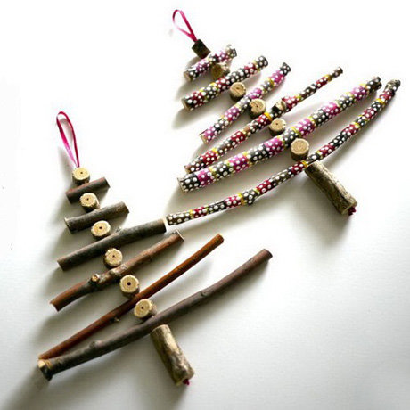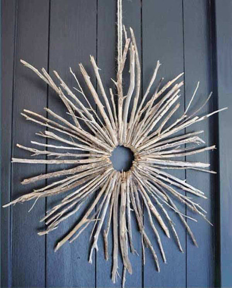 Возьмите за основу небольшой кусочек пенопласта или другого легкого материала и приклейте к нему палочки или ветки в виде звезды так, чтобы он был в центре, и его не было видно. Затем можно покрасить краской и украсить игрушку тканью, веревками, лентами, пуговицами...