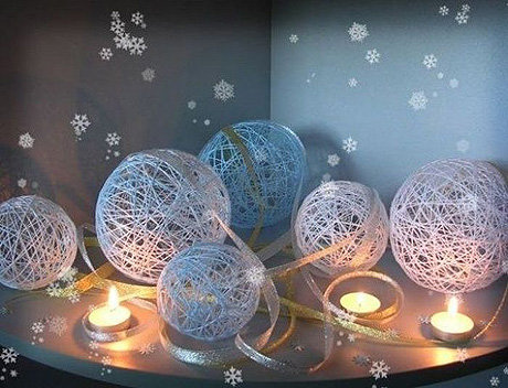 Очень красивыми получаются шарики из ниток и проволоки. Для того чтобы сделать шар из ниток, нужно надуть воздушный шар, обмотать нитками, проклеить клеем и удалить этот воздушный шарик, предварительно сдув его.