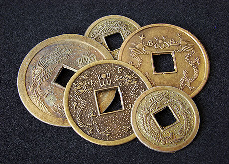 Китайские монетки с дырочками – знаменитейший и популярнейший денежный талисман. Их можно использовать как поодиночке, так и в связке. В первом случае они помещаются в кошелек или носятся на шее в качестве личного амулета. А во втором – располагаются в зоне богатства, скрепленные красной или золотой лентой.